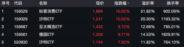 另外,沙特ETF、德国ETF、亚太精选ETF等均大涨超7%。其中,德国ETF换手率超1800%,亚太精选ETF、沙特ETF换手率也均超700%。