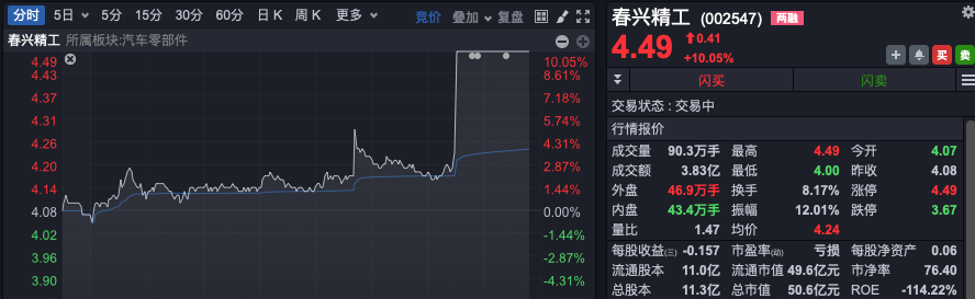 汽车零部件板块短线拉升。春兴精工涨停,肇民科技涨超10%,天汽模、浙江荣泰、恒帅股份、万通智控、成飞集成等跟涨。