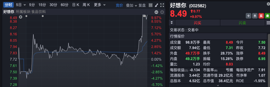 食物板块短线拉升。好念念你涨停,来伊份此前封板,良品铺子、麦趣尔、有友食物、煌上煌、紫燕食物等跟涨。