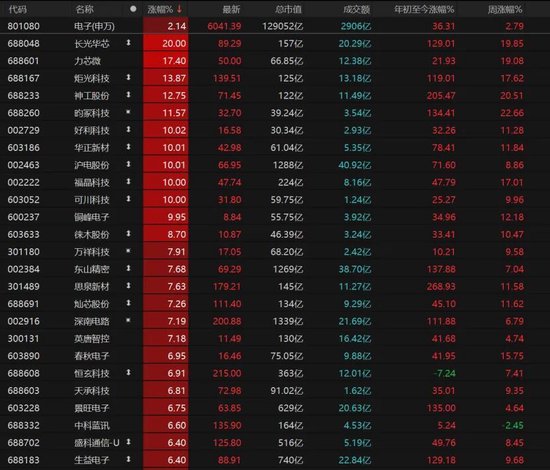 9只电子股涨停,长光华芯“20cm”涨停,好利科技(维权)、华正新材、沪电股份、福晶科技、可川科技、铜峰电子涨停。