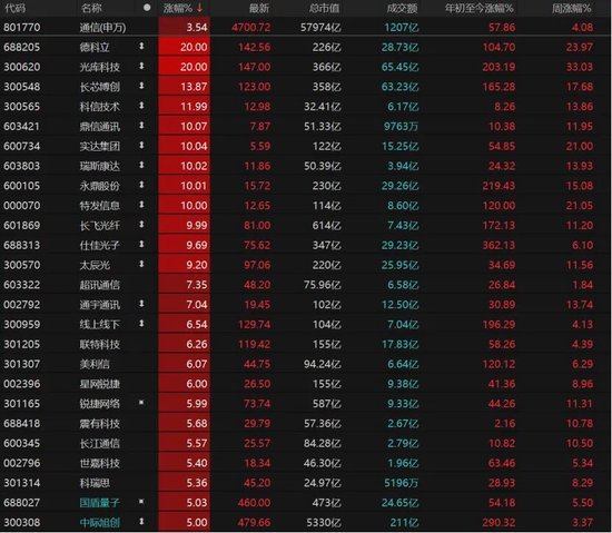 8只通讯个股涨停,德科立、光库科技“20cm”涨停,长芯博创、科信本事涨幅跨越10%,鼎信通讯(维权)、实达集团(维权)、瑞斯康达、永鼎股份、特发信息(维权)、长飞光纤涨停。