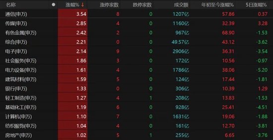 31个申万一级行业中,除了国防军工、交通运载微跌,其余均收涨,14个板块涨幅跨越1%。通讯、传媒、有色金属、电子板块领涨,石油石化、食物饮料、农林牧渔微涨。