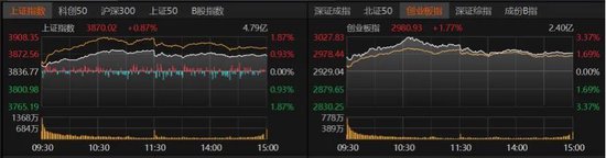 终结当天收盘,沪指收涨0.87%报3870.02点,创业板指收涨1.77%报2980.93点,深证成指收涨1.53%。科创50、沪深300、上证50、北证50均收红,但涨幅均不跨越1%。