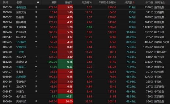 商场获利效应显耀,合计4300只个股收涨,涨停股95只;993只个股收跌,跌停股5只。当天有5只个股日成交额跨越100亿元,中际旭创收涨5%报479.66元/股,新易盛收涨4%;蓝色光标链接飘红,涨1.4%;阳光电源涨近5%,宁德期间微涨;胜宏科技、立讯精密、兆易创新涨势可以;多氟多当天大涨7.26%。
