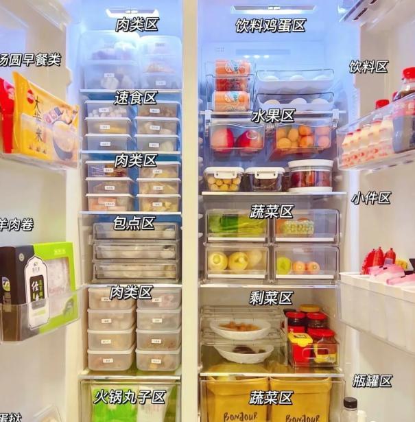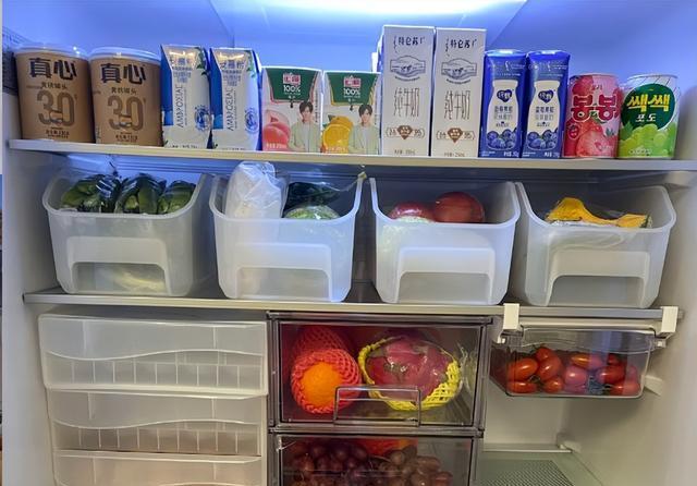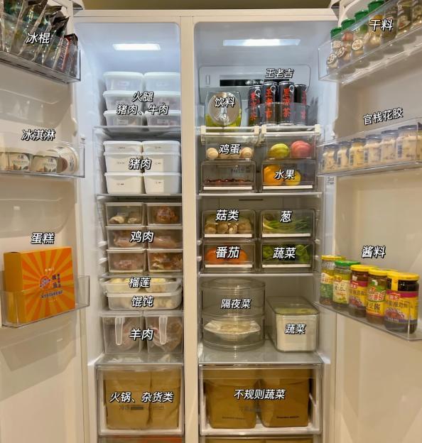收纳盒整皆地罗列在雪柜里面,每一个都承载着特定的食品类别,给东谈主一种井井有条的视觉感受。