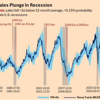 再看上头这张图的情况就更“吓东说念主”了,因为现时的好意思国重卡销量果然径直跌破了“3倍设施差”的下限。在统计学里,这关联词独一0.15%可能性的“极点事件”,讲明商场也曾不是往往的伤风发热,而是干与了某种“休克”气象,而这种极小概率事件在往日五十年中的六次阑珊统共出现了,一次也没落下过。你看图中2025年8、9和10月贯穿三个月那条险些垂直掉下去的弧线,这波阑珊信号的杀伤力和速率,以至向上了2008年那次金融危险。这背后其实等于企业信心澈底崩了,寰宇被高额的贷款利息和乱糟糟的生意环境压得喘不外气来,只可采选集体“躺平”。
