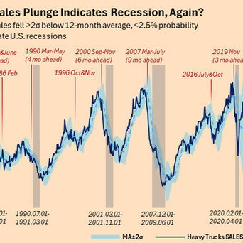 往日五十年中每一次经济阑珊前,重型卡车的销量王人跌破了“2倍设施差”底限。在统计学上,这种“祸殃事”发生的概率独一2.5%,妥妥的小概率事件。要知说念,买这种大卡车的王人是物流大佬和工业巨头,这帮东说念主精致得很。他们只须意想到畴昔半年到一年运脚要跌、订单要缩水,就会立马锁死钱袋子,一辆车也未几买。看起来,1990年、2000年和2008年那几次大阑珊发生前几个月,重卡销量王人精确地踩到了这根红线上。