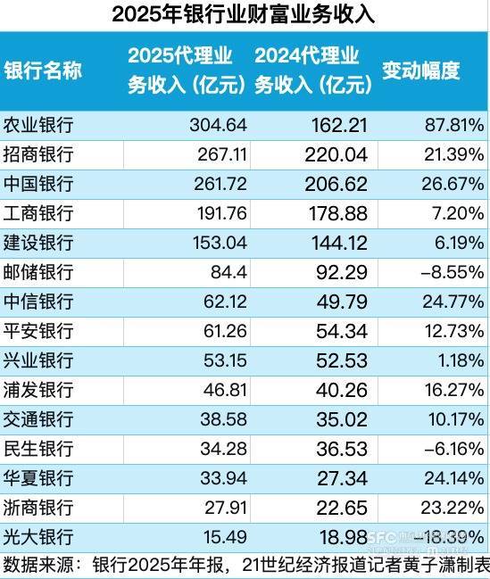 据21世纪经济报说念记者统计,六大国有银行和九家上市股份行共计15家银行中,有12家在2025年结束了钞票业务的正增长。15家银行的代理业务收入规划向上1600亿元,平均增幅达21%。