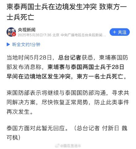 当地技艺5月28日,总台记者获悉,柬埔寨国防部发布音问称,柬埔寨与泰国两国士兵于28日早间在边境地区发生突破,柬方又名士兵示寂。柬国防部暗示将连续与泰国国防部疏通,寻求共同不停决策,尽快归附平常地方,防护此类事件再次发生。泰国方濒临此暂无回复。(央视新闻)