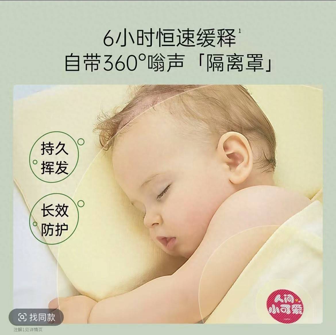 在某电商平台袋鼠姆妈婴童用品旗舰店,一款植物精油贴的家具页面提到了“自然植萃精油贴 6H贴身守护”的内容,从家具称号及页面展示内容来看,并未明确说起防蚊驱蚊干系内容,但在家具先容及笃定先容中,均有走漏防蚊子叮咬的干系内容。在该家具的视频先容中,字幕还说起“夏天带孩子出门被咬得阑珊包;8H长效守护不含避蚊胺。”在家具笃定中,还出现婴儿睡觉的图片,并配以“自带360°嗡声‘鉴别罩’”的内容,并辅导“科学配比植物精油;远离夏季嗡嗡扯后腿;植萃精油开释气息驱赶叮扰”。
