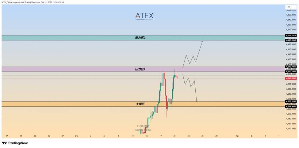 时候面来看,黄金刻下的撑抓区位于4229–4250好意思元隔邻,屡次出现买盘迹象,是短线多头的进攻防地。若跌破该区域,则有可能快速下探4140好意思元一带。上方压力区1在4370–4390好意思元,这是近期的中枢阻力区,亦然多空分水岭,若有用突破并站稳,其上方空间将灵通,进一步见地指向压力区2,即4497–4516好意思元区间。走势结构裸露,现在金价在压力区1下沿反复震憾,短线可能出现两种旅途:若买盘继续,突破4390好意思元后有望加快冲击压力区2;若上攻乏力,则可能回落至4250好意思元撑抓区域再行蓄力。整躯壳局仍保管震憾偏强。
