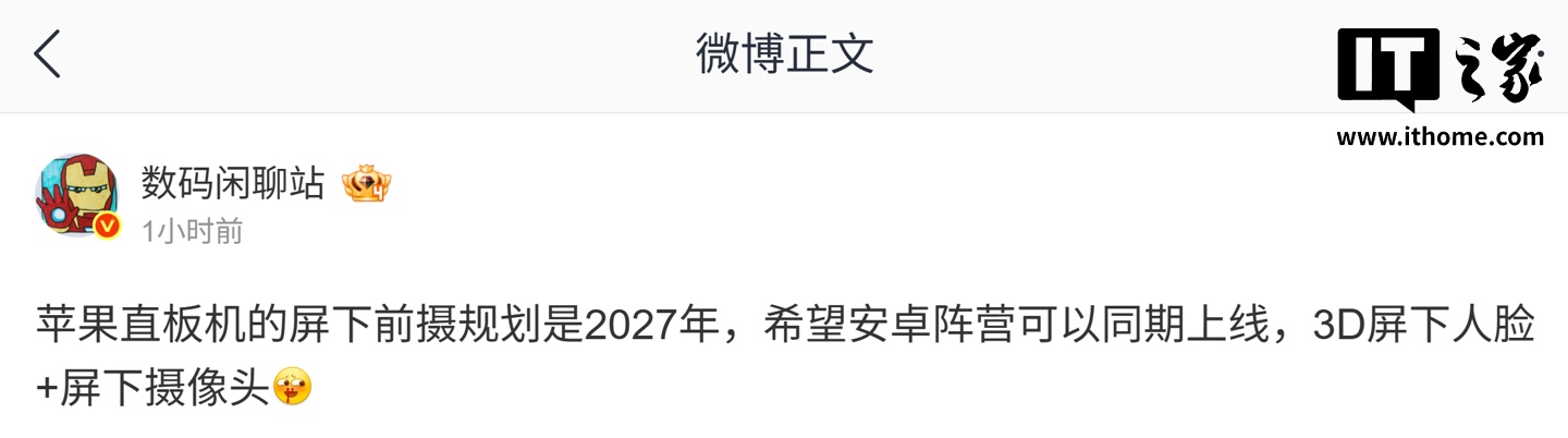 IT之家 11 月 8 日音信,博主 @数码谈天站 今天在微博涌现,苹果直板手机的屏下前置录像头现在策动是 2027 年上线。