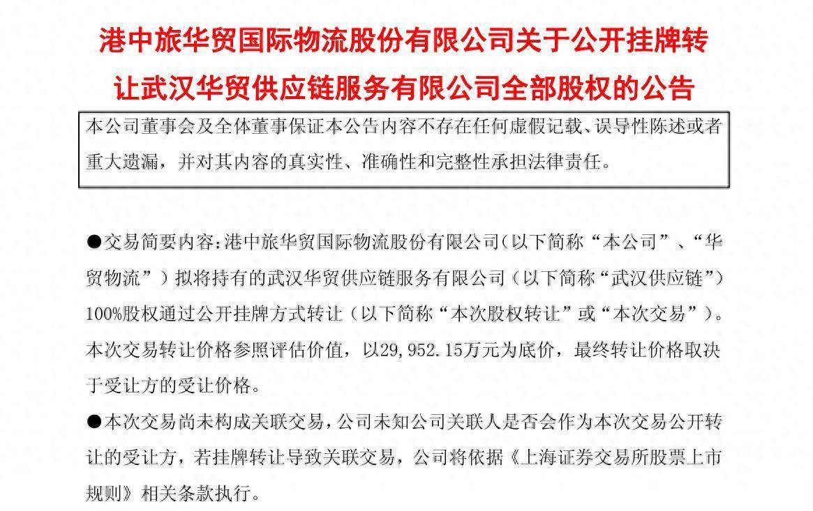 11月21日晚间,华贸物流(603128)公告称,公司拟将抓有的武汉华贸供应链办事有限公司(以下简称“武汉供应链”)100%股权通过公开挂牌面容转让。本次往还转让价钱参照评估价值,以29952.15万元为底价kaiyun中国官方网站,最终转让价钱取决于受让方的受让价钱。